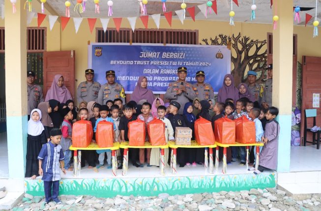 MUARAENIMONLINE.COM– Sebagai wujud dukungan terhadap program 100 hari kerja Presiden Republik Indonesia, Polres Nagan Raya melaksanakan kegiatan “Jum’at Bergizi” pada Jumat, 8 November 2024, pukul 10.00 WIB, bertempat di PAUD Tunas Bangsa, Desa Lhok Seumot, Kecamatan Beutong, Kabupaten Nagan Raya. Kegiatan ini bertujuan untuk meningkatkan asupan gizi dan kesehatan bagi anak-anak di wilayah tersebut.