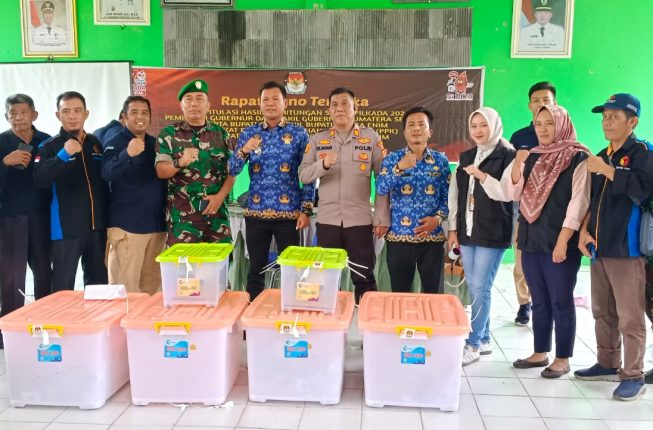 LHOKSEUMAWE, MUARAENIMONLINE.COM  – Kapolres Lhokseumawe, AKBP Henki Ismanto bersama unsur Muspida meninjau proses penyortiran dan pelipatan surat suara Pemilu 2024 di gudang logistik KIP Lhokseumawe, Senin (8/1/2024).