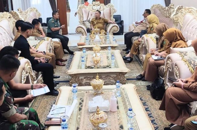 LHOKSEUMAWE, MUARAENIMONLINE.COM  – Kapolres Lhokseumawe, AKBP Henki Ismanto bersama unsur Muspida meninjau proses penyortiran dan pelipatan surat suara Pemilu 2024 di gudang logistik KIP Lhokseumawe, Senin (8/1/2024).