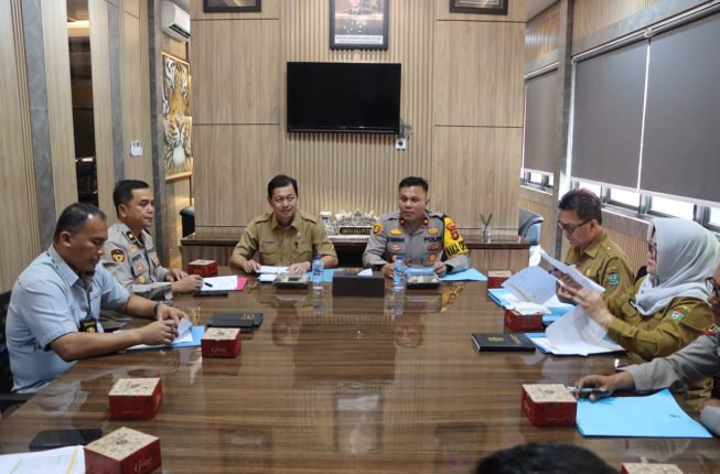 LHOKSEUMAWE, MUARAENIMONLINE.COM  – Kapolres Lhokseumawe, AKBP Henki Ismanto bersama unsur Muspida meninjau proses penyortiran dan pelipatan surat suara Pemilu 2024 di gudang logistik KIP Lhokseumawe, Senin (8/1/2024).