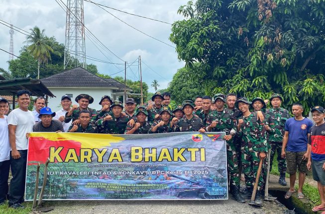 MUARAENIMONLINE.COM -  Rangkaian kegiatan HUT ke-75 Yonkav 5/DPC makin mendekati puncak. Kali ini, puluhan prajurit Yonkav 5/DPC bersenjatakan cangkul dan mesin rumput menyerbu Dusun II, Desa Karang Endah guna melaksanakan Karya Bakti (Karbak) bersama dengan warga sekitar, (06/02/2025).