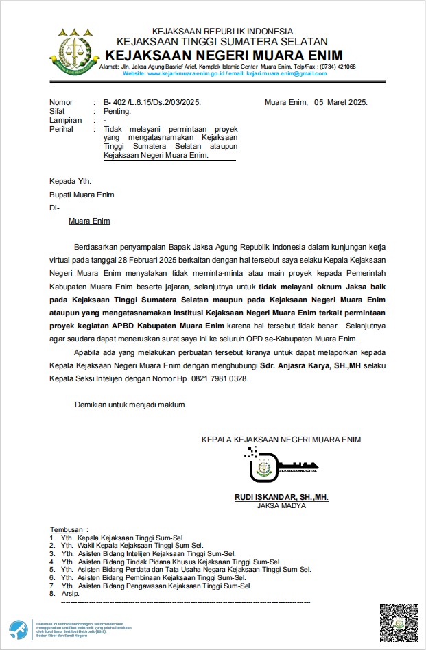 Adapun Surat yang diterbitkan oleh Kejaksaan Negeri (Kajari) Muara Enim tersebut, Nomor : B-402/L.6.15/Ds.2/03/2025. Sifat :Penting. Lampiran -. Perihal : Tidak Melayani permintaan proyek yang mengatasnamakan Kejaksaan Tinggi Sumatera Selatan ataupun Kejaksaan Negeri Muara Enim.