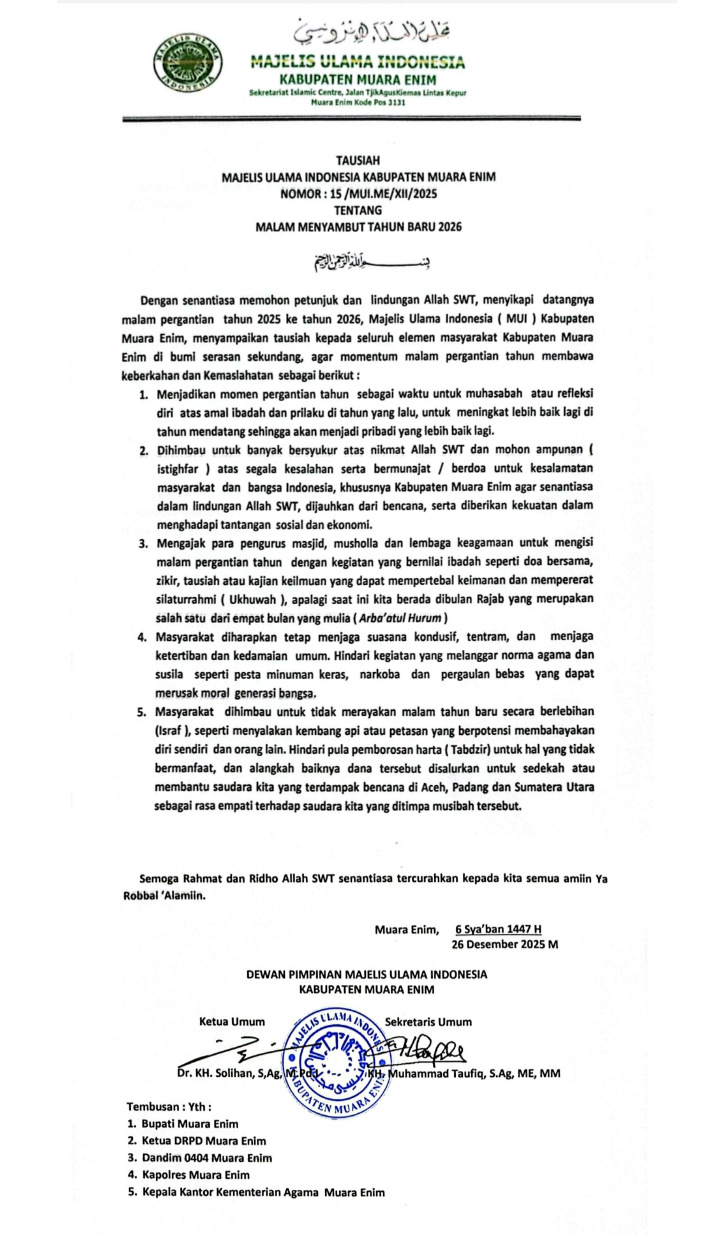 Himbauan tersebut tertuang dalam Tausiah MUI Kabupaten Muara Enim Nomor: 15/MUI.ME/XII/2025 tentang Malam Menyambut Tahun Baru 2026. Tausiah ini ditandatangani oleh Ketua MUI Kabupaten Muara Enim Dr. KH. Solihan, S.Ag., M.Pd dan Sekretaris KH. Muhammad Taufik, S.Ag., ME., MM.