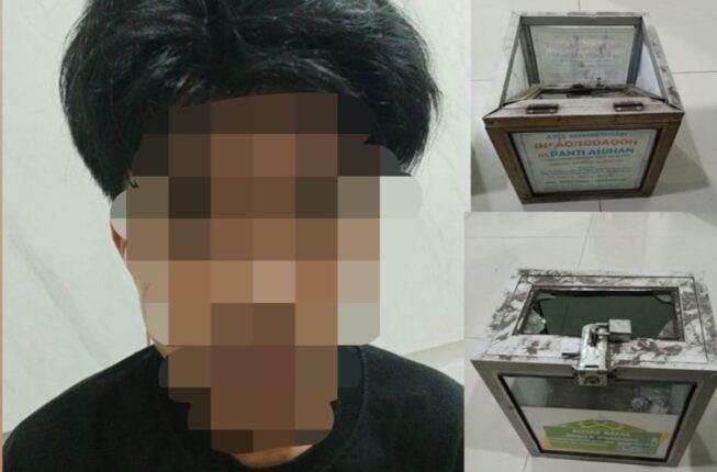 Dalam kasus ini, polisi mengamankan sejumlah barang bukti berupa 2 buah kotak amal yang sudah pecah kacanya, 1 bilah parang bergagang karet berwarna hitam.