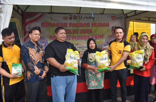 MUARAENIMONLINE.COM – Polres Muara Enim, Polda Sumatera Selatan, menggelar Gerakan Pangan Murah sebagai bentuk nyata dukungan terhadap program Presiden Republik Indonesia, Prabowo Subianto, dalam menjaga stabilitas pangan dan membantu masyarakat memperoleh kebutuhan pokok dengan harga terjangkau. Kegiatan ini dipusatkan di Lapangan Mapolres Muara Enim pada Jumat (8/8/25) dan disambut antusias oleh ratusan warga.