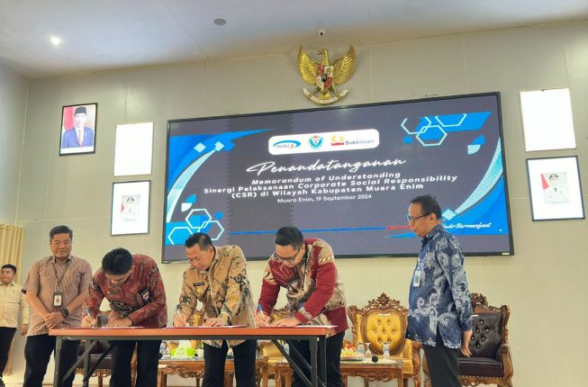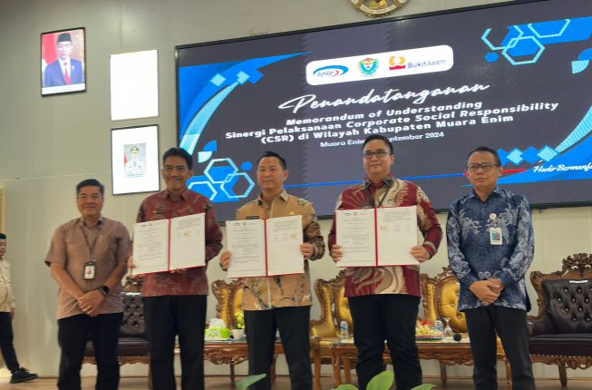 MUARAENIMONLINE.COM – PT Bukit Asam Tbk (PTBA) bersama Pemerintah Kabupaten Muara Enim dan Badan Pengawasan Keuangan dan Pembangunan (BPKP) Provinsi Sumatera Selatan resmi menandatangani Nota Kesepahaman (Memorandum of Understanding/MoU) Sinergi Pelaksanaan Corporate Social Responsibility (CSR) di wilayah Kabupaten Muara Enim.